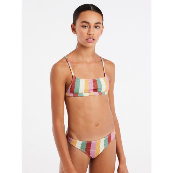 Bustier-Bikini mit Streifen-Design und eingearbeitetem Glanzgarn; Cups mit herausnehmbaren Pads; verstellbare Träger, die auf der Rückseite über Kreuz verlaufen; Hose in Slipform; PFC-frei; Material 76% Polyester, 12% Metallfaser, 12% Elastan.